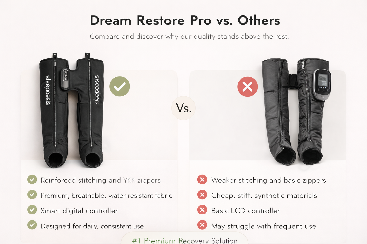 Dream Restore Pro is engineered to professional-grade standards with premium materials and technology. Unlike generic boots with single-chamber, fixed-pressure designs, we offer multi-chamber sequential compression, fully adjustable pressure range (20-80+ mmHg), medical-grade durable materials, and a comprehensive 1-year warranty. Generic boots typically feature basic single-chamber inflation, fixed pressure settings (30-50 mmHg), standard fabric construction, and limited 30-90 day warranties. You get elite-level recovery technology at an accessible price point.