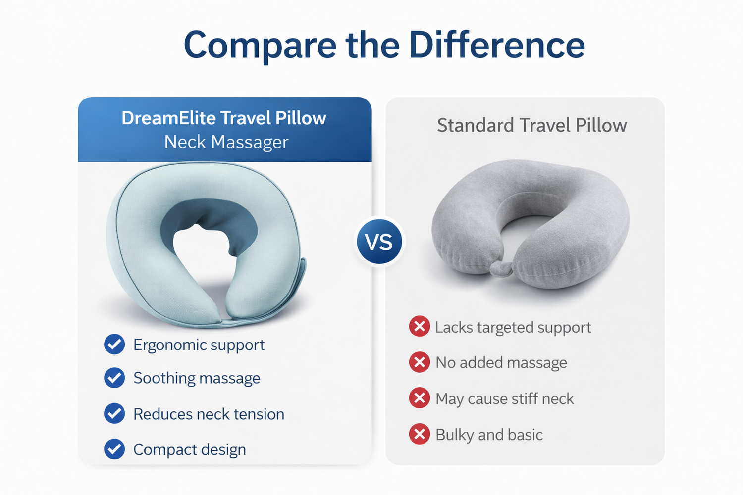 Unlike standard travel pillows, the DreamElite Travel Pillow Neck Massager is designed to actively support your neck with ergonomic shaping and soothing massage. Less stiffness, more comfort—wherever you go.